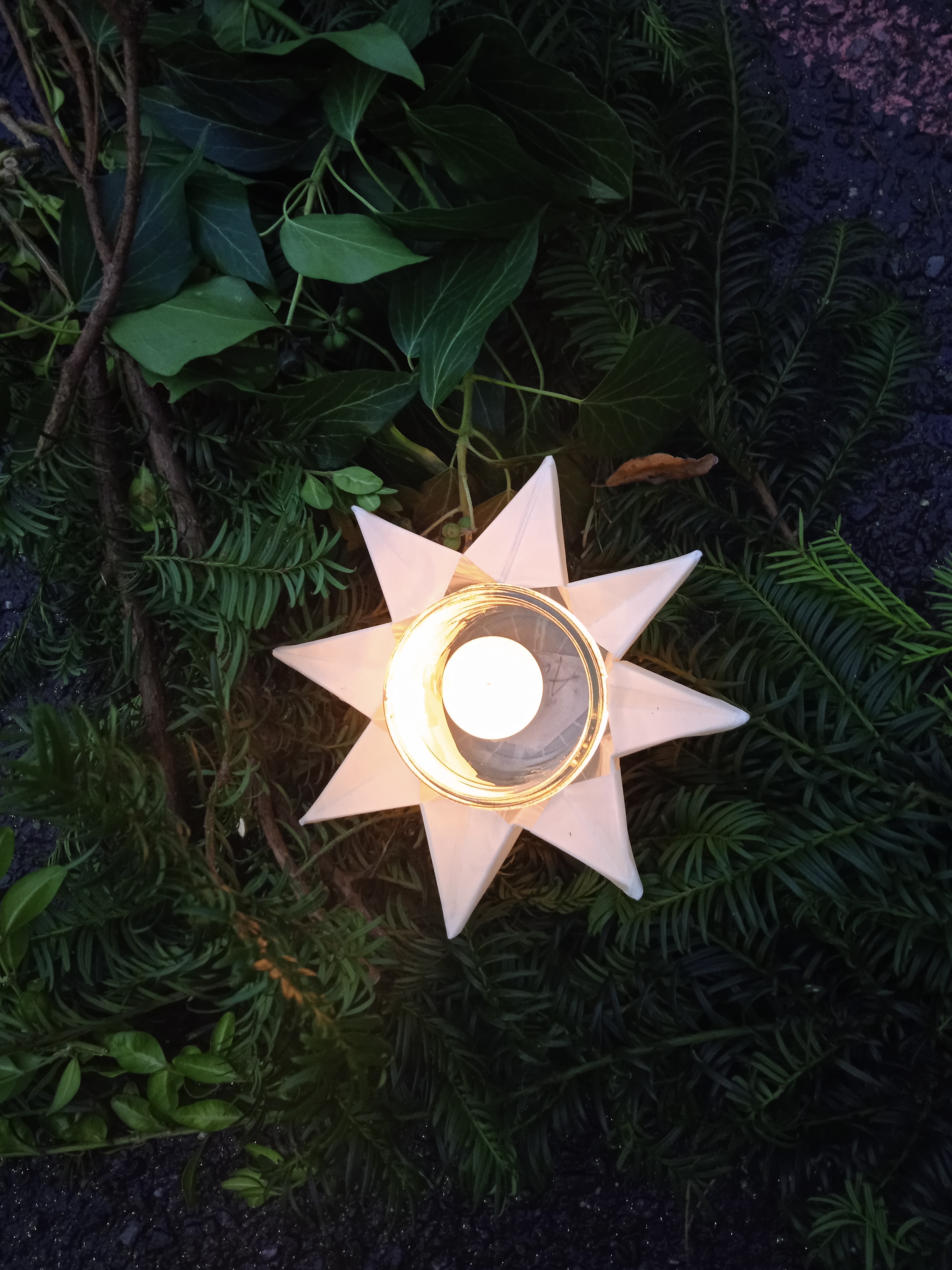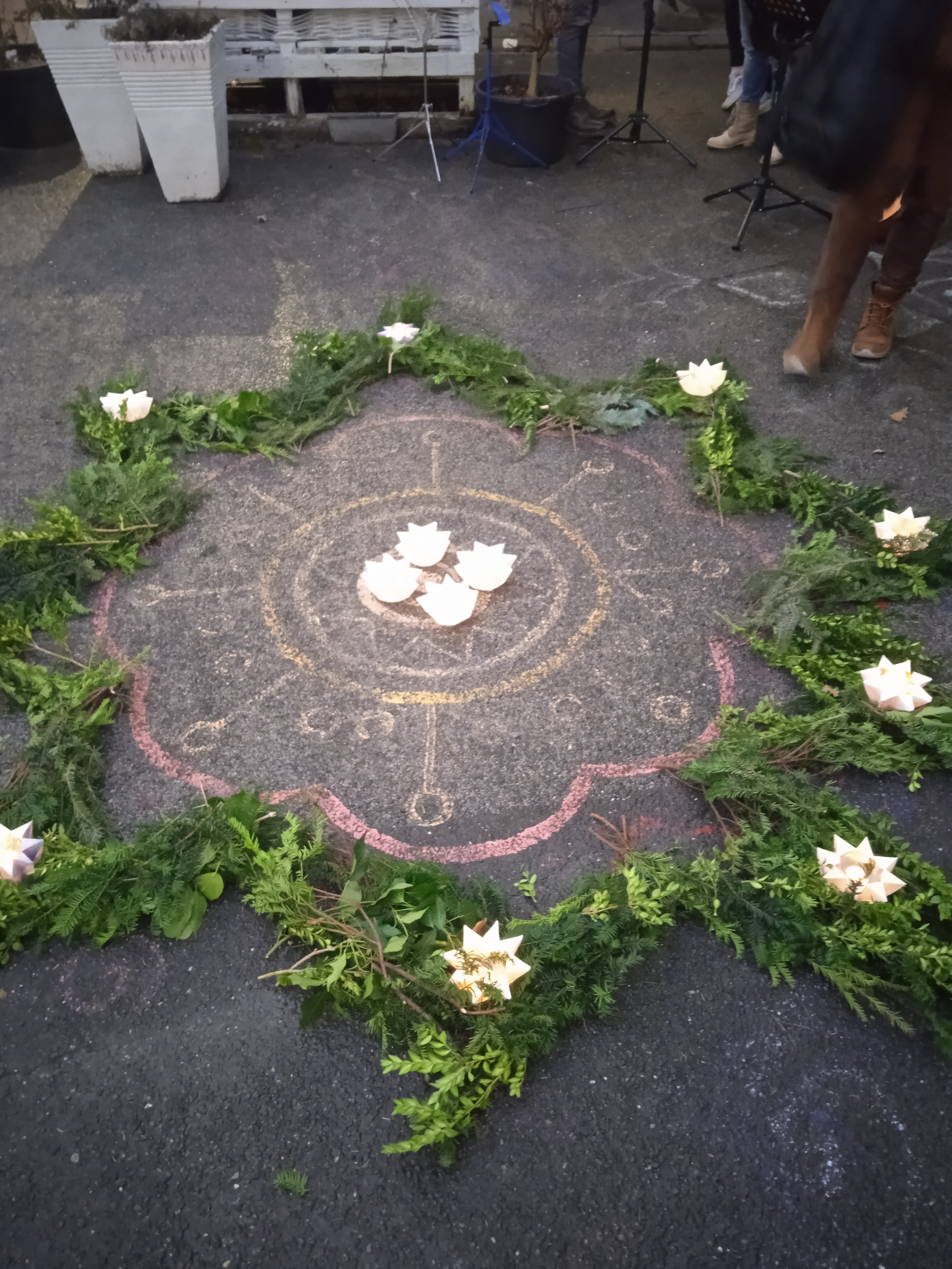 Daraufhin wurden an alle Anwesenden Weihnachtsbaumkerzen verteilt, eigentlich, damit man sie mit heim nimmt und dort in Ruhe anzünden und ihr Licht betrachten kann. Aber symbolische Handlungen entwickeln ja manchmal eine ganz eigene Dynamik, sodass sehr schnell jemand auf die Idee kam, seine Kerze ans Friedenslicht zu halten und die Flamme dann weiterzugeben, sodass, ungeplant aber wunderschön, bald jeder eine brennende Kerze in der Hand hielt und sich der Innenhof in ein Lichtermeer verwandelte.
