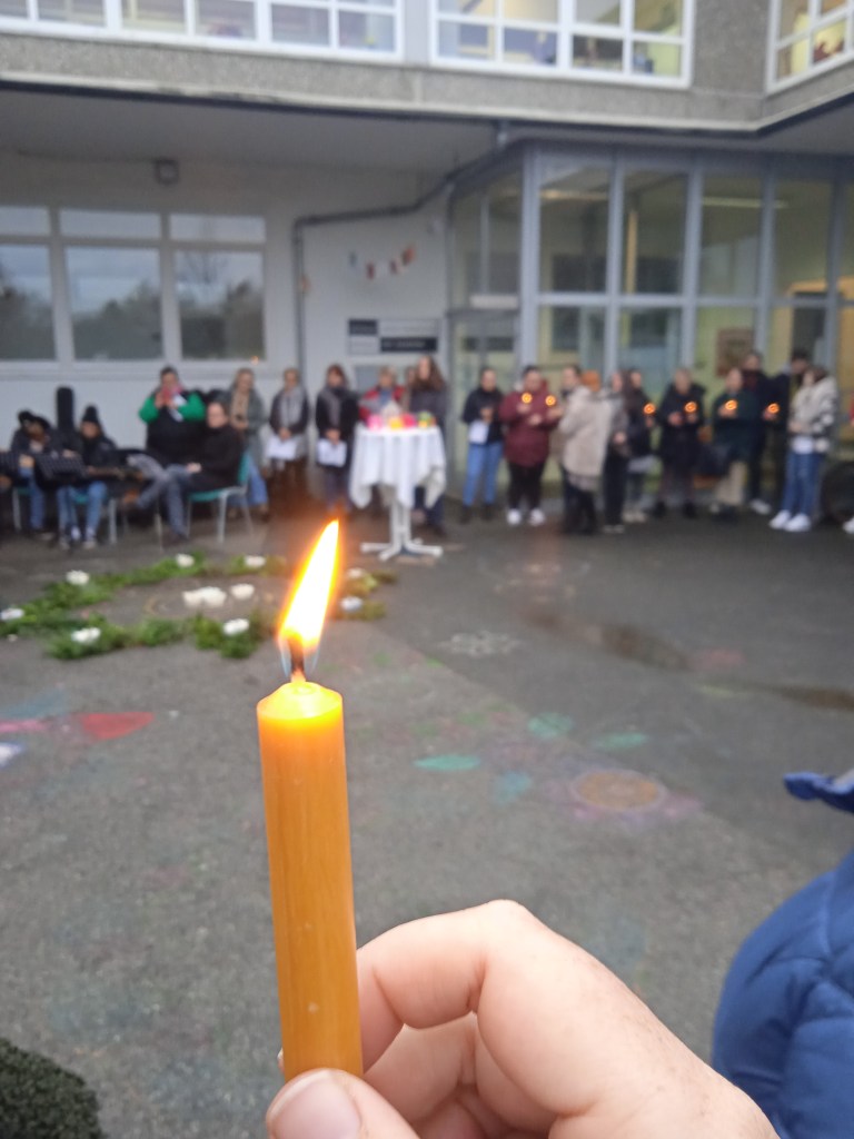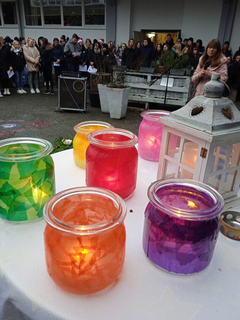 Mit diesem letzten Blogbeitrag vor Heiligabend wünsche ich euch allen frohe und gesegnete Weihnachten. An der Schule hatten wir heute eine Weihnachtfeier im Innenhof, wobei viele Schüler*innen sich inhaltlich, musikalisch und gestalterisch eingebracht haben. Eine wichtige Rolle spielte dabei das Friedenslicht aus Bethlehem. Eine Schülerin und ich hatten es aus unseren jeweiligen Kirchengemeinden migebracht (doppelt hält besser). Einige Schüler*innen hatten sieben Windlichter in den Farben des Regenbogens gestaltet. Schüler*innen einer meiner Klassen hatten sich zu allen sieben Farben des Regenbogens gute Wünsche überlegt. Symbolisch haben wir dann Teelichter am Friedenslicht entzündet und sie in die farbigen Windlichter hinein gestellt. Ein sichtbarer, leuchtender Wunsch nach Frieden, Liebe, Hoffnung, Licht und Ruhe für alle Menschen.
