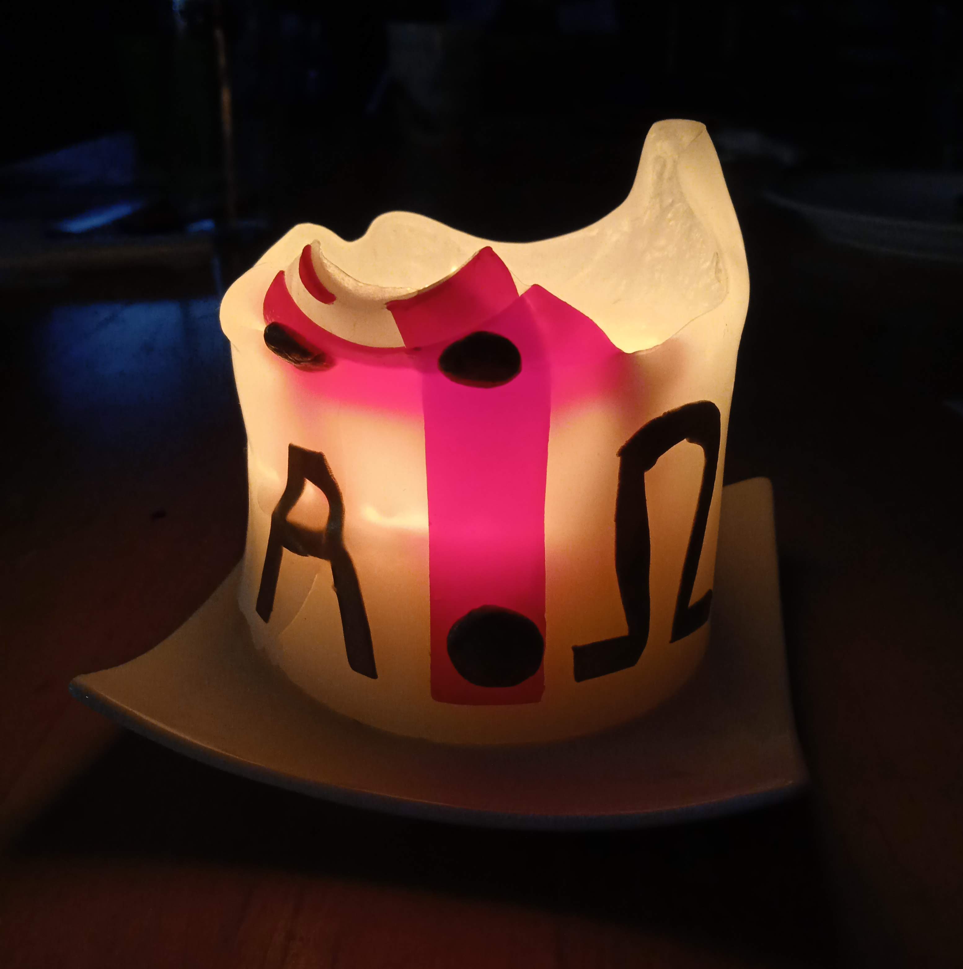 Seit zwei Jahren brenne ich, verströme Licht und Wärme und erinnere alle im Haus an Jesus, den Auferstandenen. Vom Kreuz aus rotem Wachs ist nicht mehr viel übrig. Aber das das Alpha und das Omega sind noch gut zu lesen: Jesus Christus, der Anfang und das Ende, er war immer da und wird es noch sein, wenn alles andere nicht mehr ist.